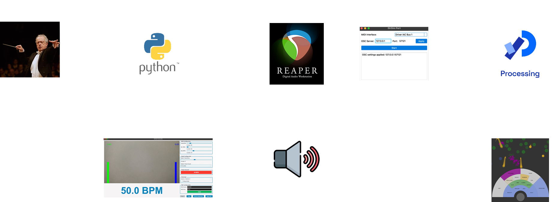 DirSim (Director Simulator) es un ecosistema integral de control y visualización musical. DirSim permite a un usuario dirigir una orquesta virtual utilizando gestos de sus manos en tiempo real. El sistema integra seguimiento biométrico por visión computacional, conversión dinámica de protocolos (MIDI a OSC) y retroalimentación visual inmersiva para una experiencia de conducción musical total.